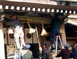 新年を目前にひかえ12月23日、丹波一の宮・出雲大神宮で氏子総代さんによるしめ縄作りが行われました。広い境内では取り替えをすまし、すっかりきれいに迎春の準備が整いました。