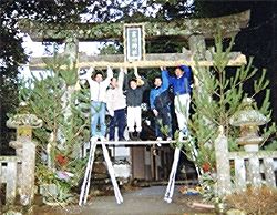 大鳥居のしめ縄を奉納する厄年の男性