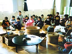 ひえ田野小学校で1月18日、ふれあい学級が開かれました。3年生のテーマは「昔の暮らし」と題して、児童37人は自宅から七輪やわらじ、洗濯板などを持ち寄り、12人のお年寄りに名前や使い方を教わりました。特に牛のわらぐつにはびっくりしていました。
