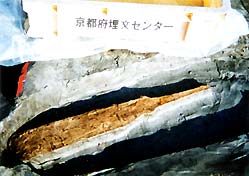 京都府埋蔵文化財調査研究センターによって、保津町山田地区で遺跡の発掘調査が昨年の12月から行われていますが、本年1月30日、2月5日に弥生時代(1750〜1800年)前と思われる、茄子型木製品(長さ60センチ、幅9センチ)が2個出土しました。