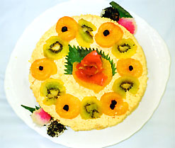 - 二種類のケーキ寿司のまわりに手毬寿司を飾り付ける。
