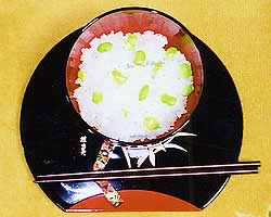 炊けたところに、ゆでた枝豆(サヤと薄皮をむく)を加えて混ぜ蒸らす。