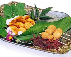 (3)に醤油たれ、きな粉、すりごま、ひき茶味をのせる。
